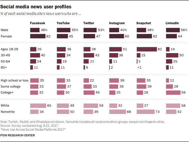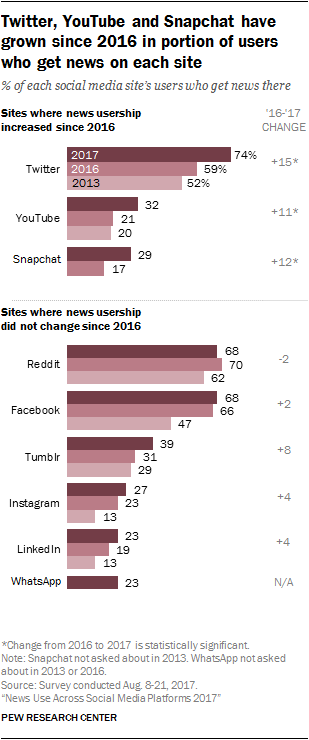 Today, 67% of U.S. adults get at least some news on social media. Twitter, YouTube and Snapchat serve as sources of news for more of their users, though Facebook still leads as a source of news for Americans. The greatest increase is among older, nonwhite, and less educated.