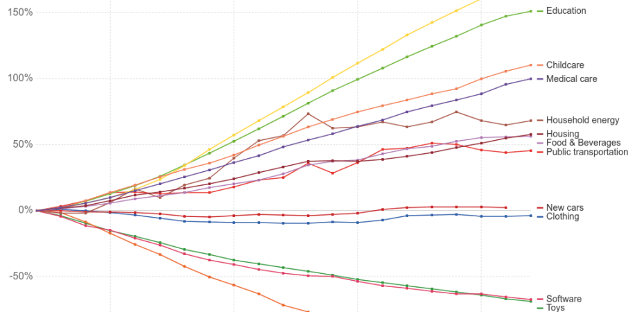 Check out this awesome data visualization here: Price changes in consumer goods and services in the USA, 1997-2017